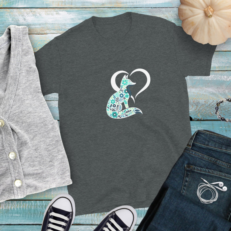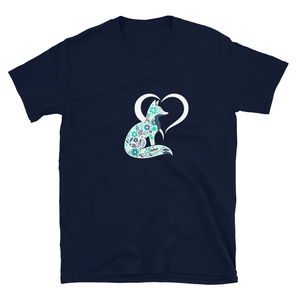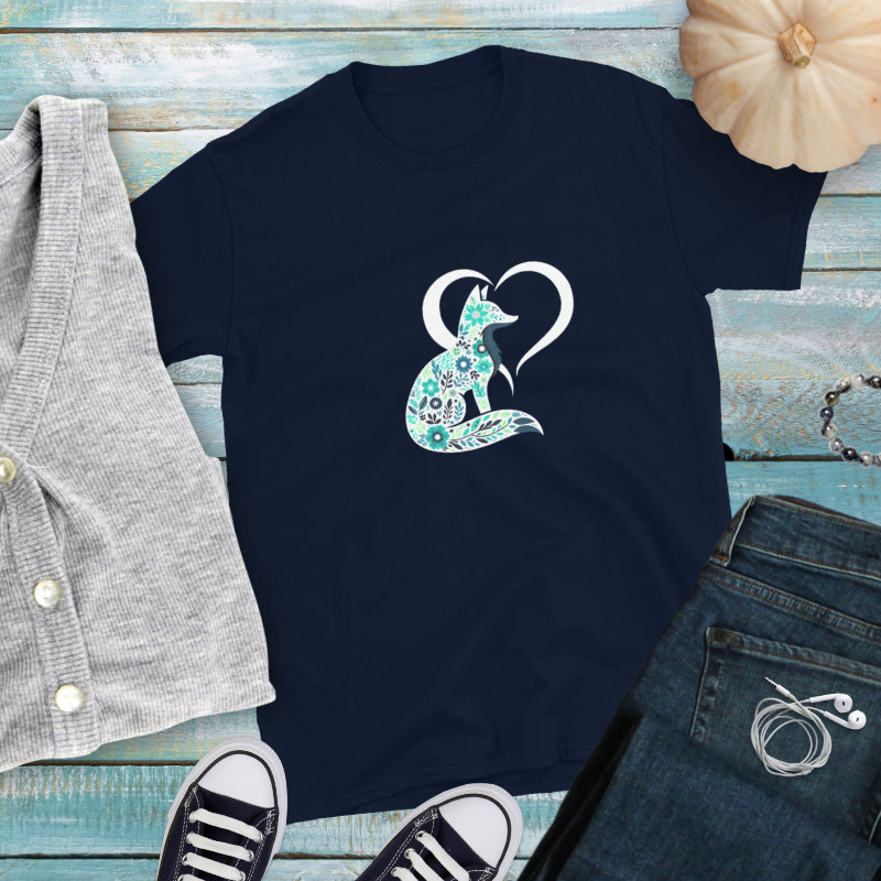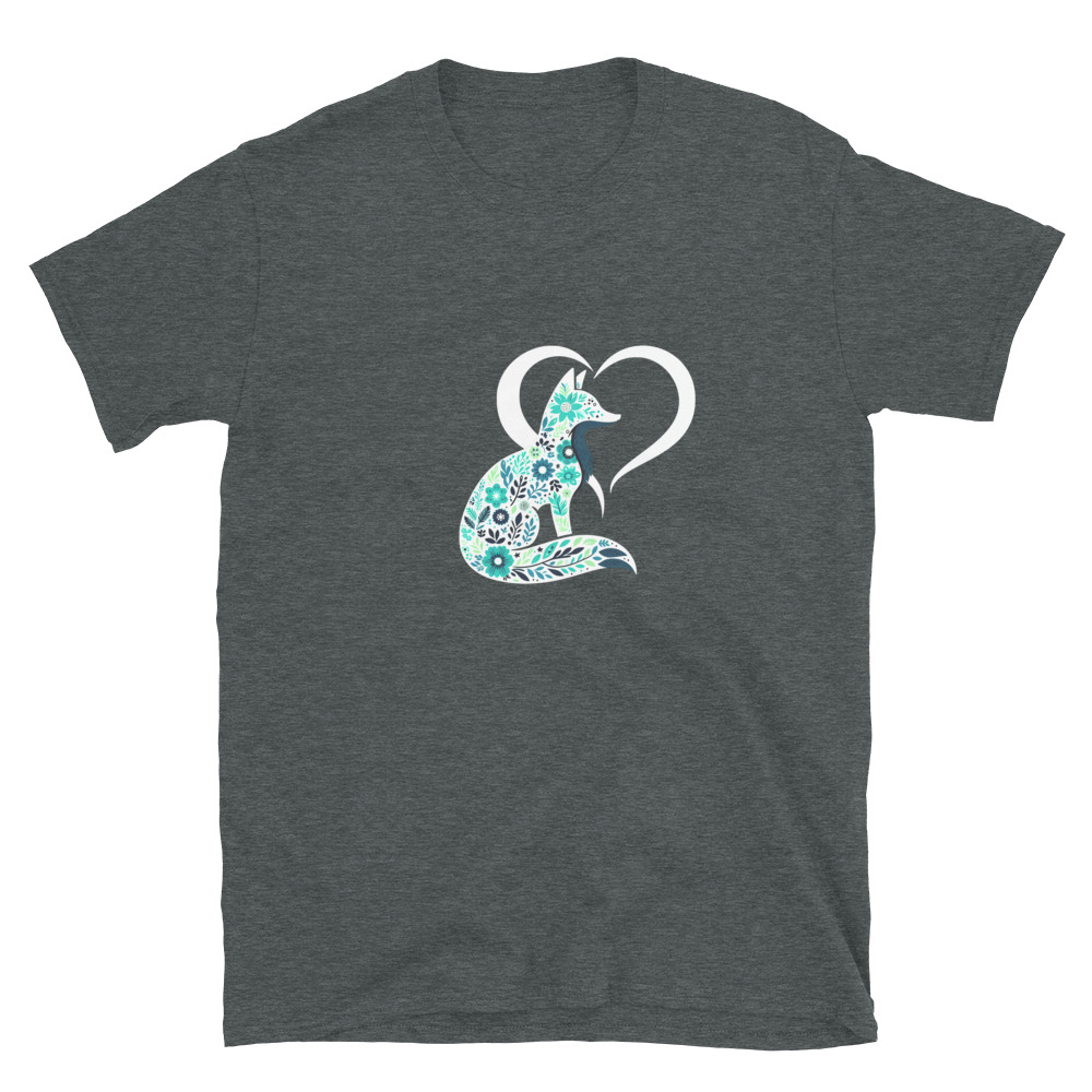 Camiseta con Bonito Diseño Imaginativo de estilo Folk en la silueta de un Elegante Zorro Ártico con Corazón