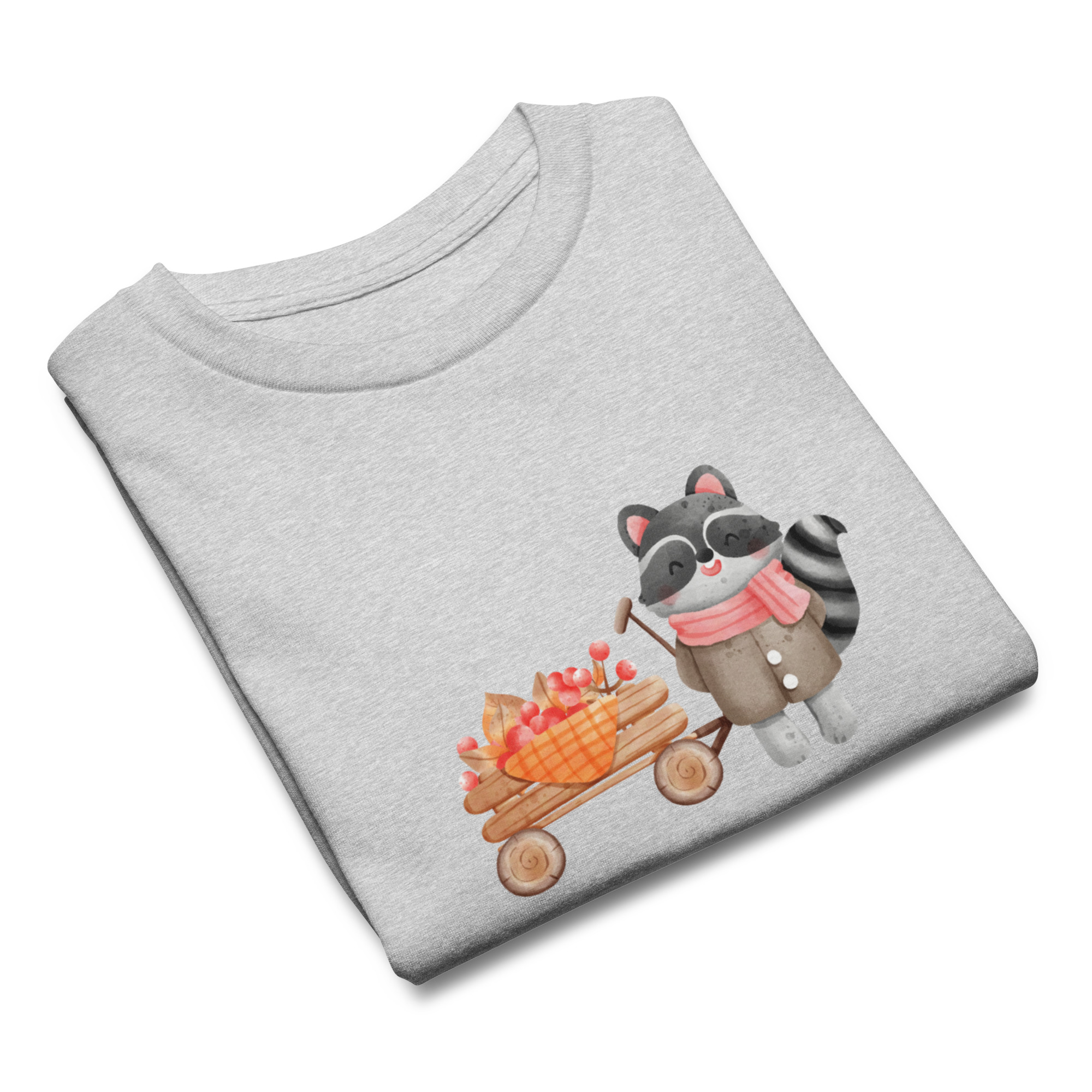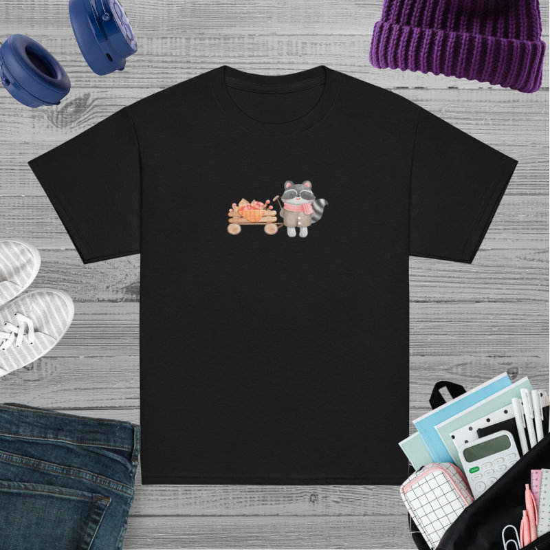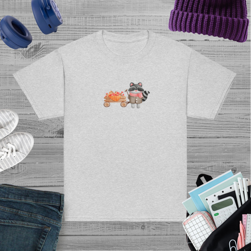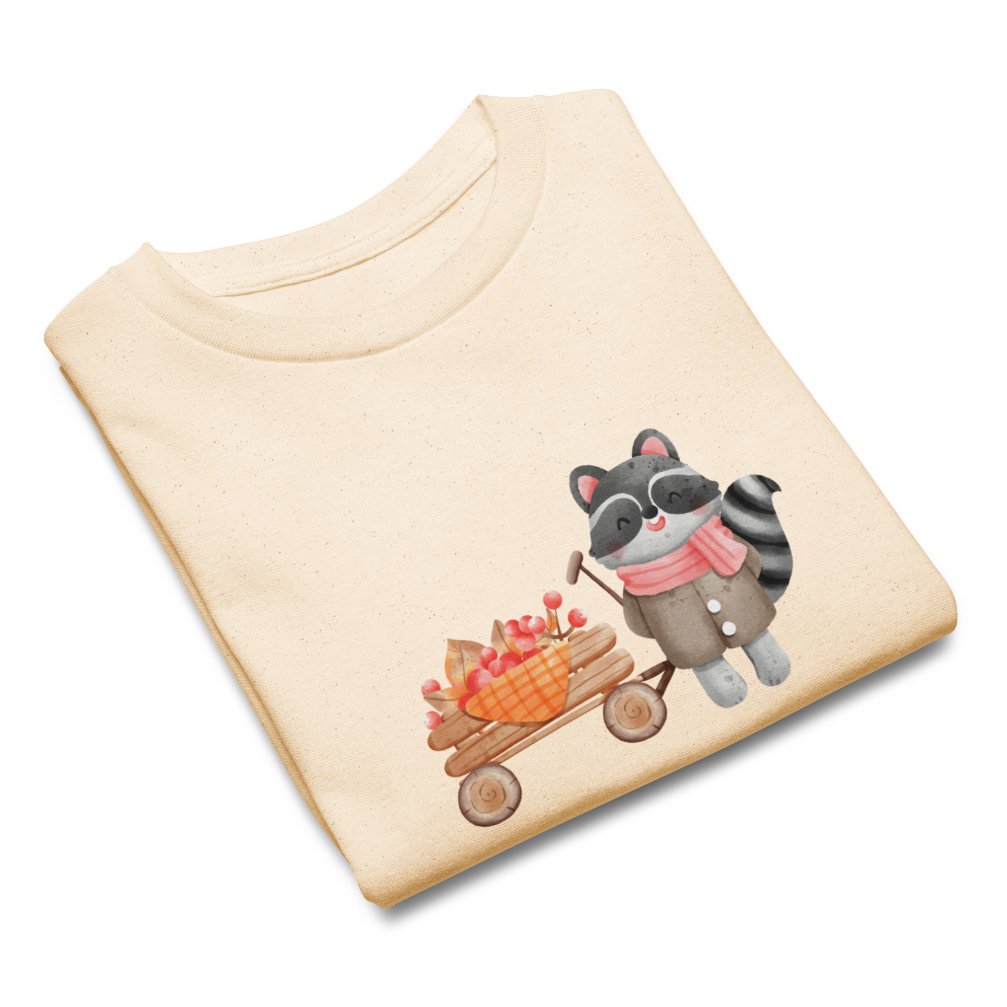 Camiseta para niño y niña con un bonito mapache con un carrito de bayas