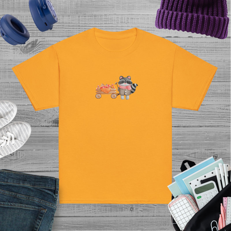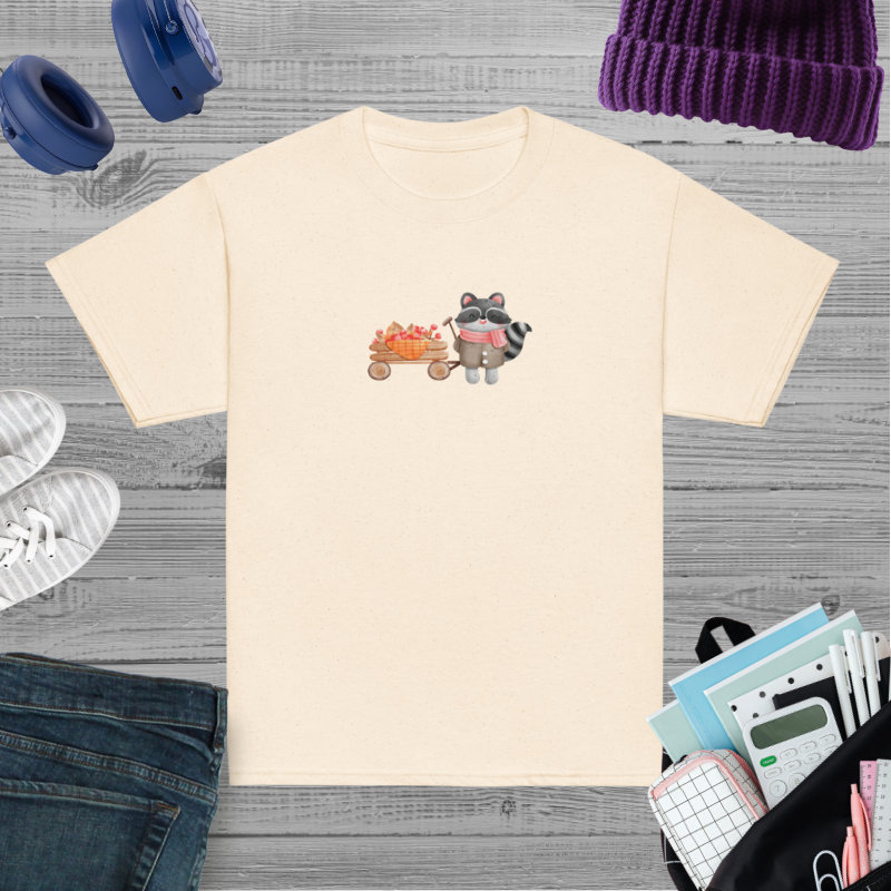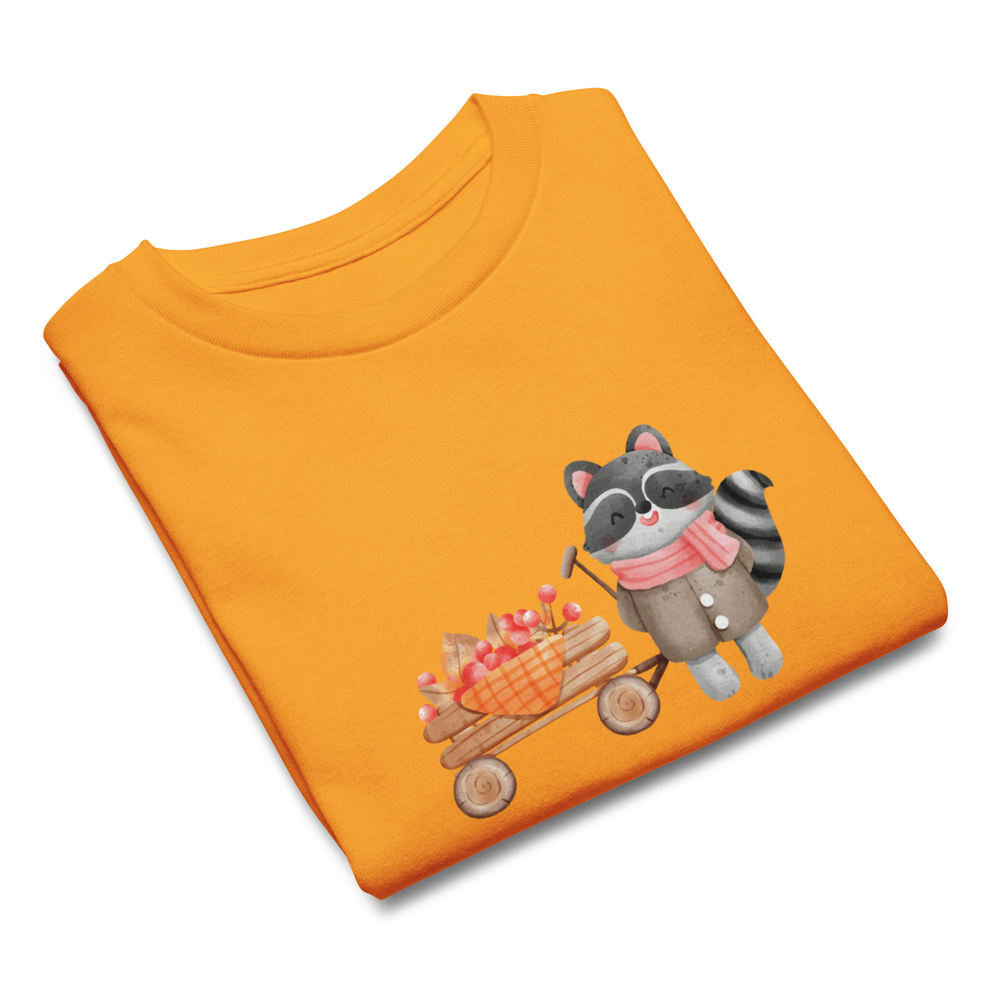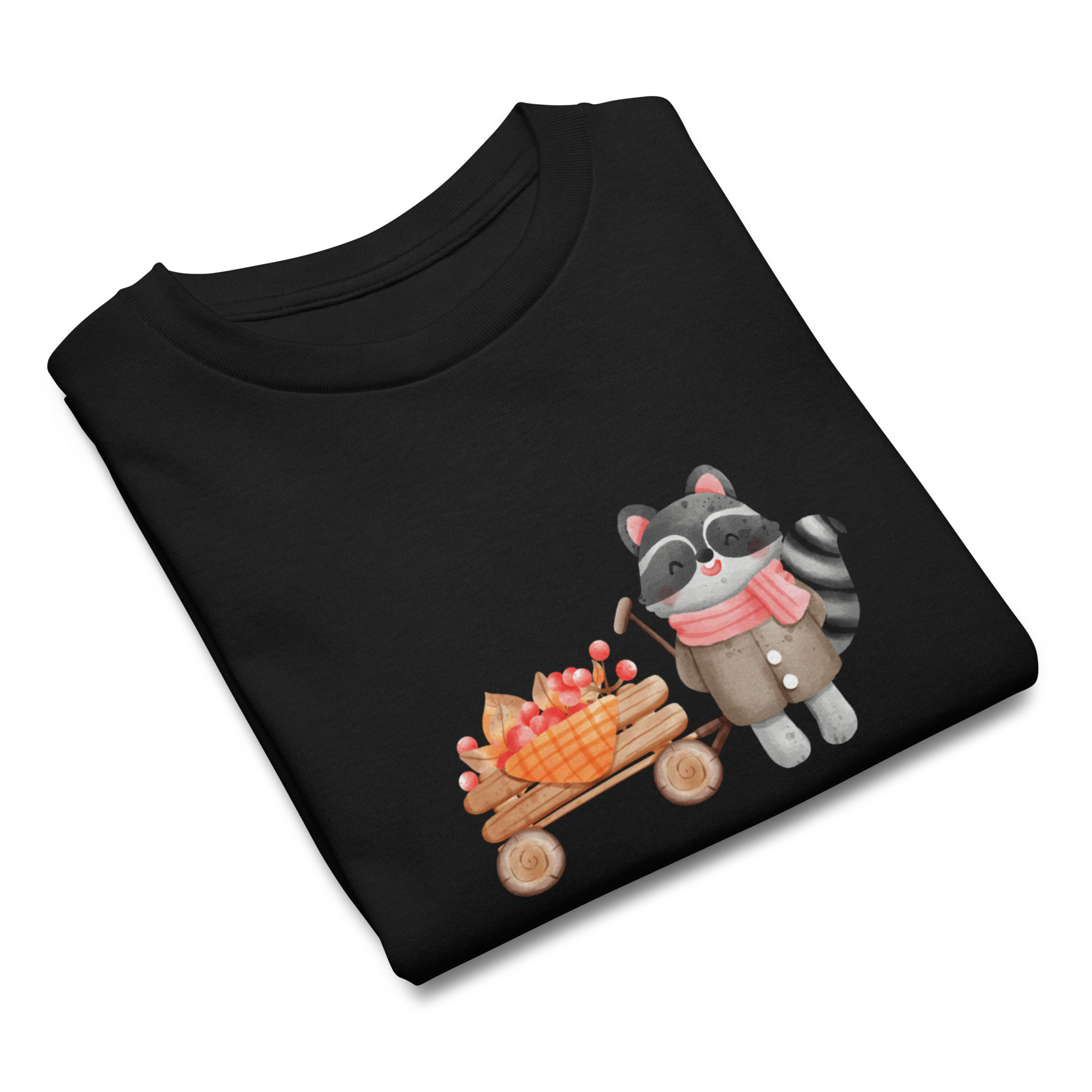 Camiseta para niño y niña con un bonito mapache con un carrito de bayas