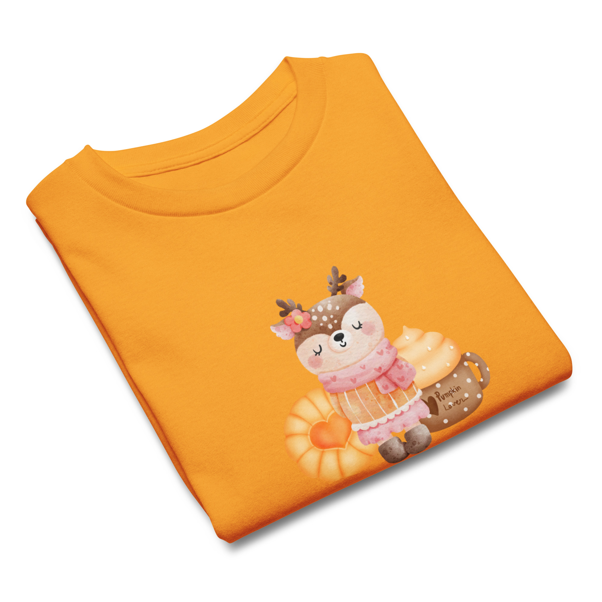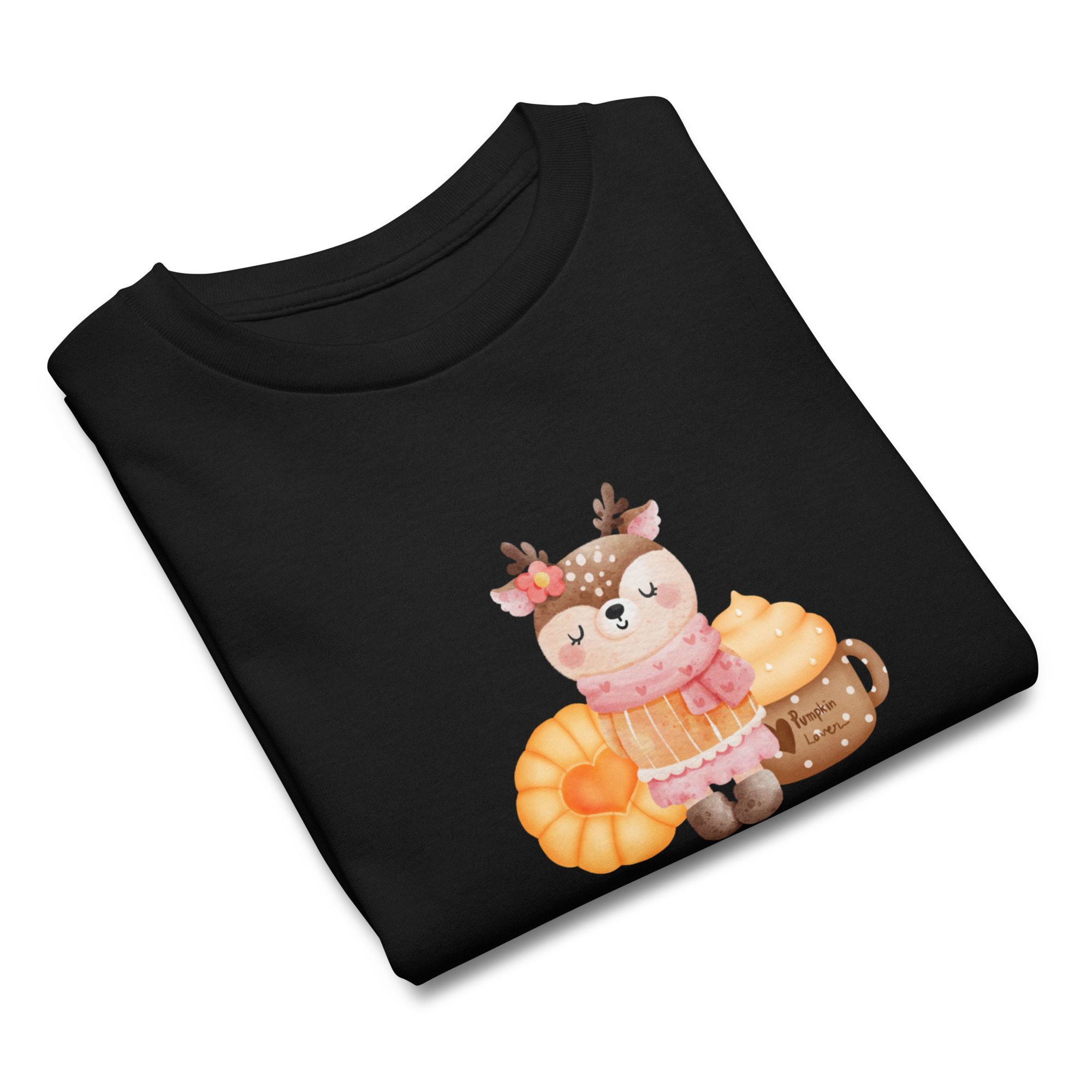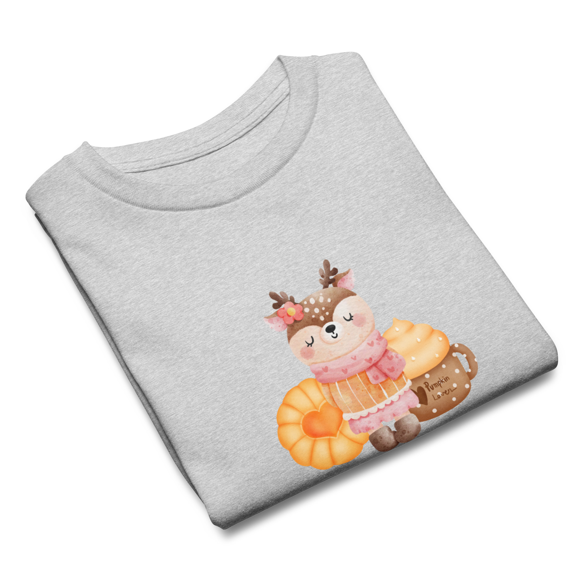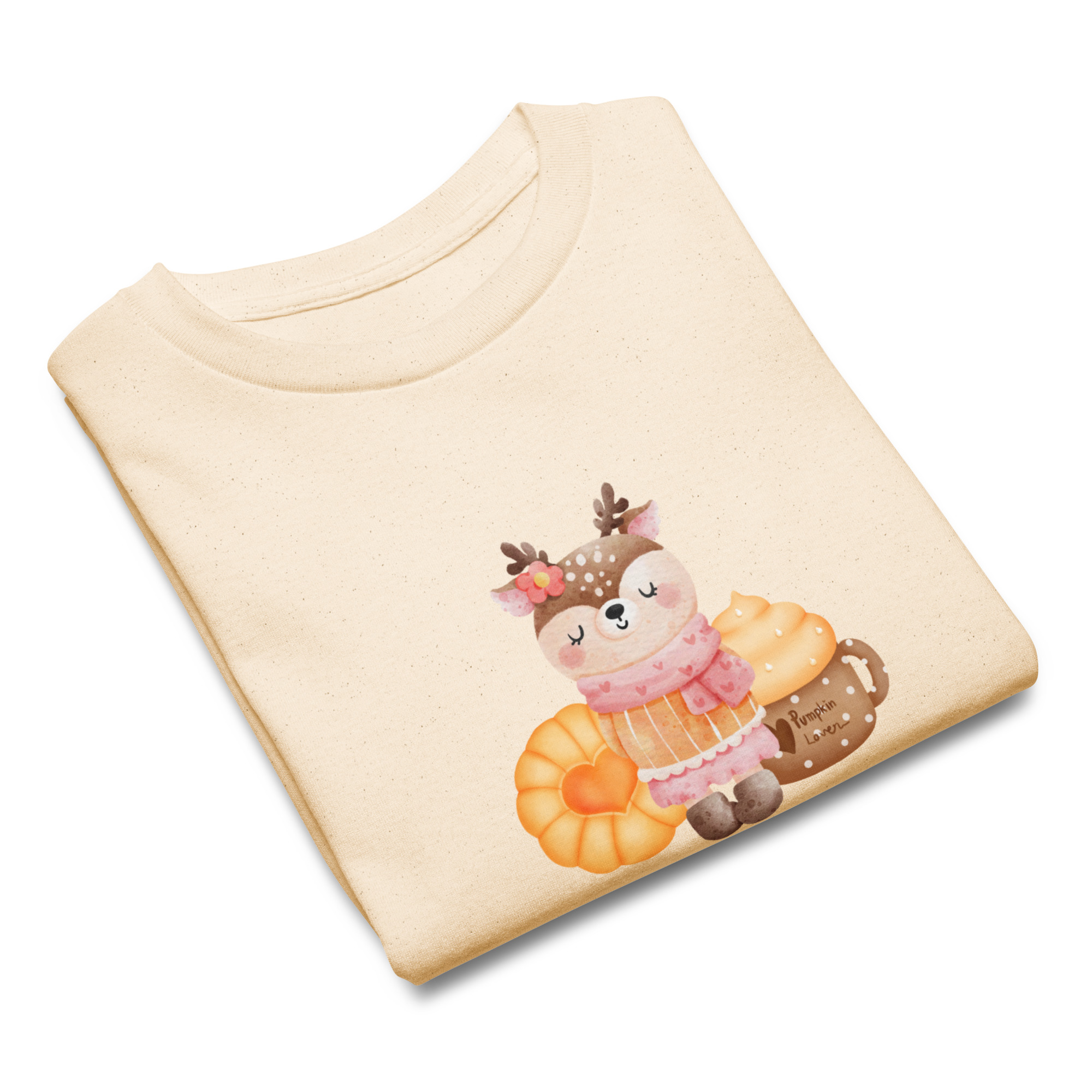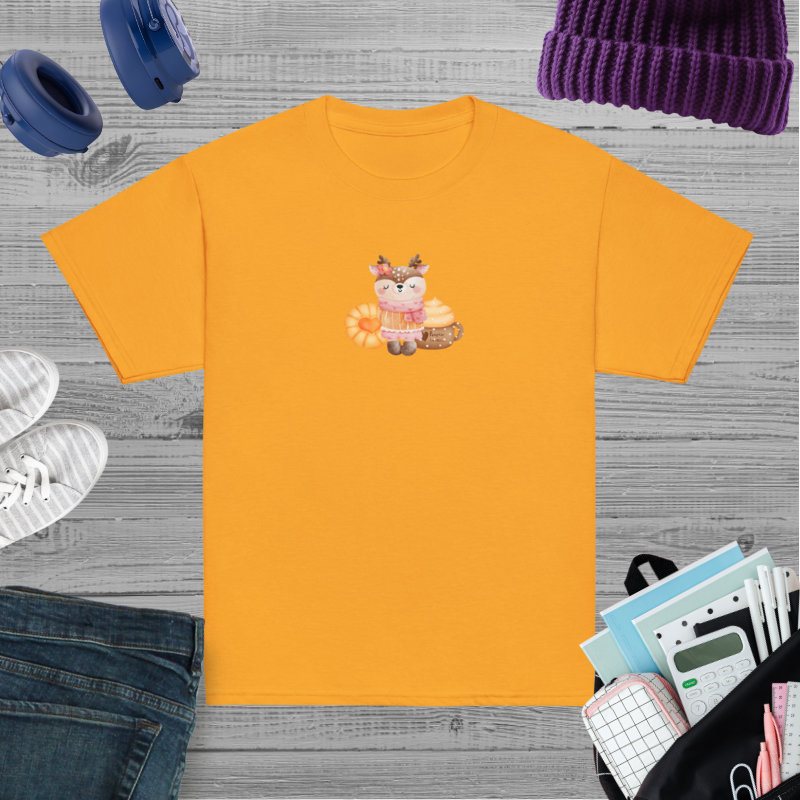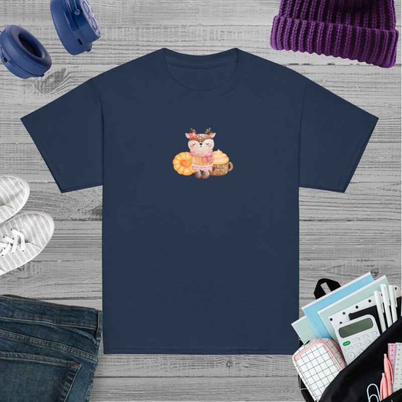 Camiseta para niño y niña con una bonita rena con pasta dulce y bebida de calabaza