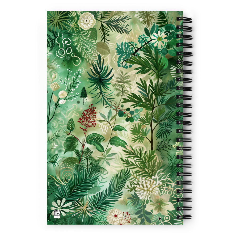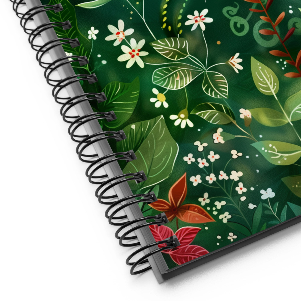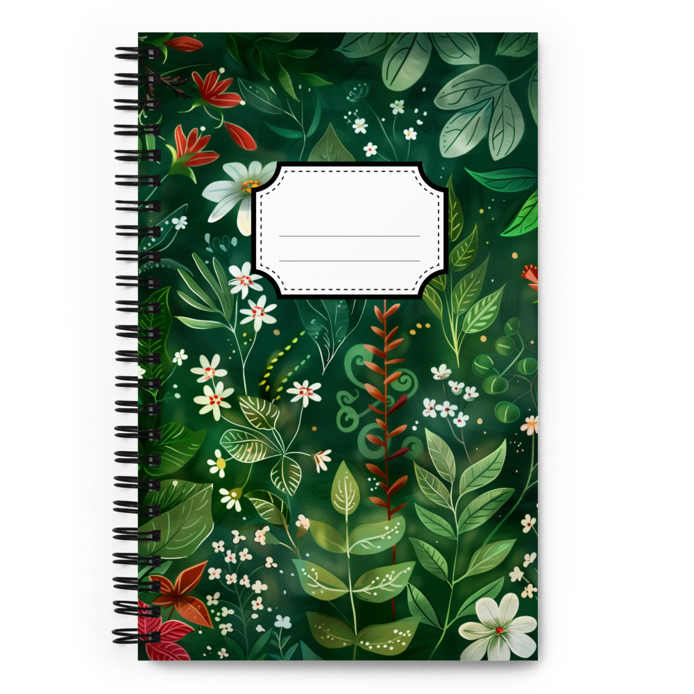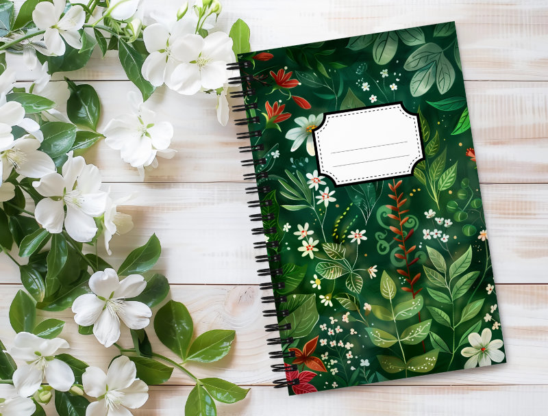 Cuaderno en Espiral con Bonito Diseño Herbal de color Verde Profundo con Flores Blancas y Rojas