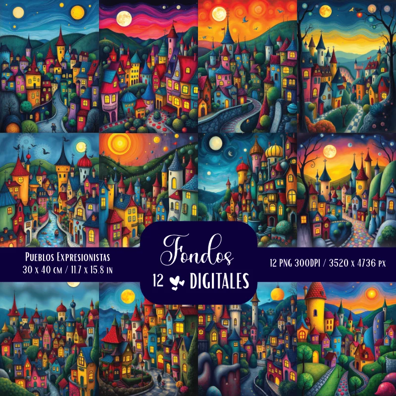 Sumérgete en mundos vibrantes y llenos de color con este paquete de 12 papeles digitales de alta calidad. Inspirados en la belleza onírica de pueblos expresionistas, estos fondos son perfectos para añadir un toque mágico y artístico a todos tus proyectos creativos, tanto personales como comerciales.