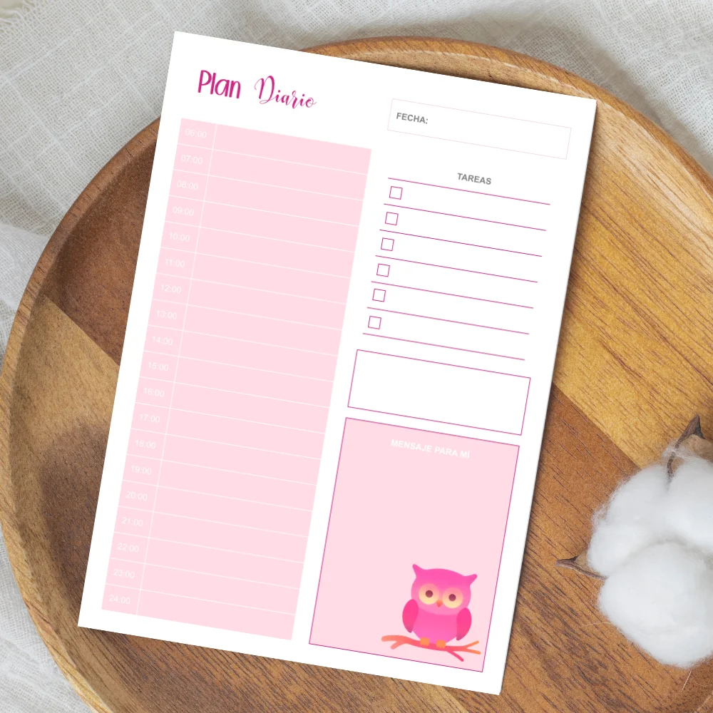 - Un modelo de página de planificación diaria con 13 decoraciones diferentes de buhos en la esquina en un PDF A4 (un PDF con 13 páginas)
