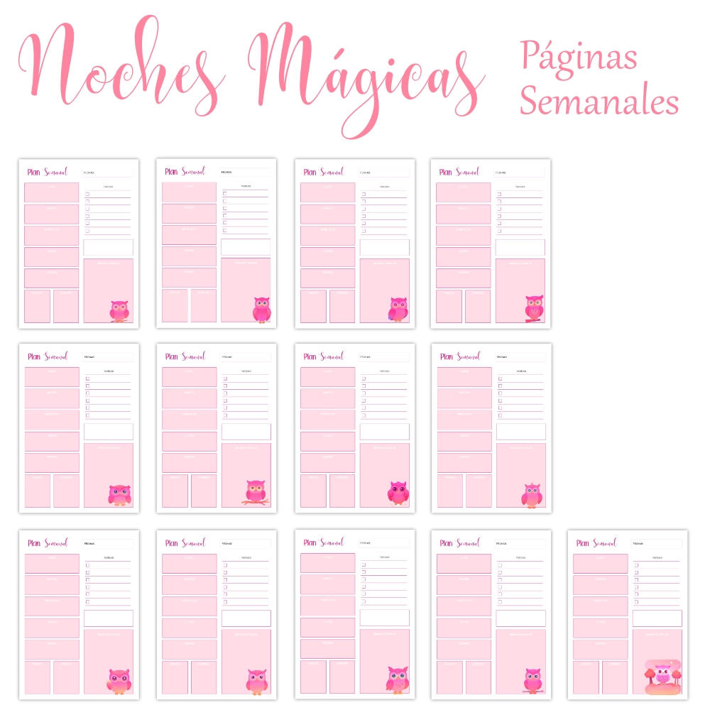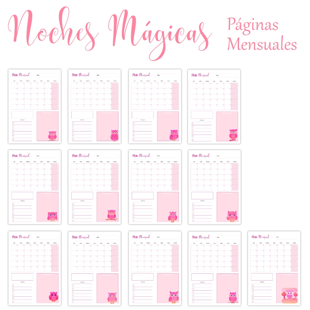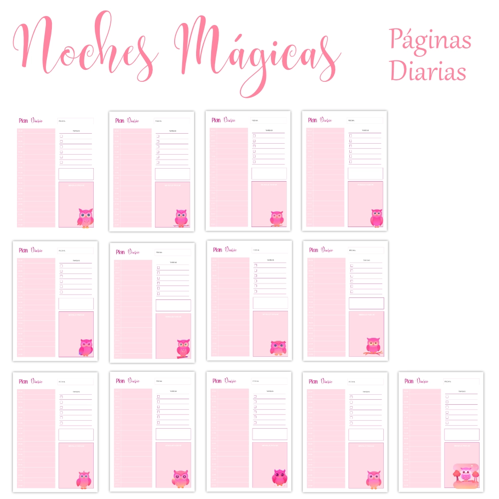 Kit de Planificador digital imprimible Noches Mágicas con bonitos búhos en degradados rosas