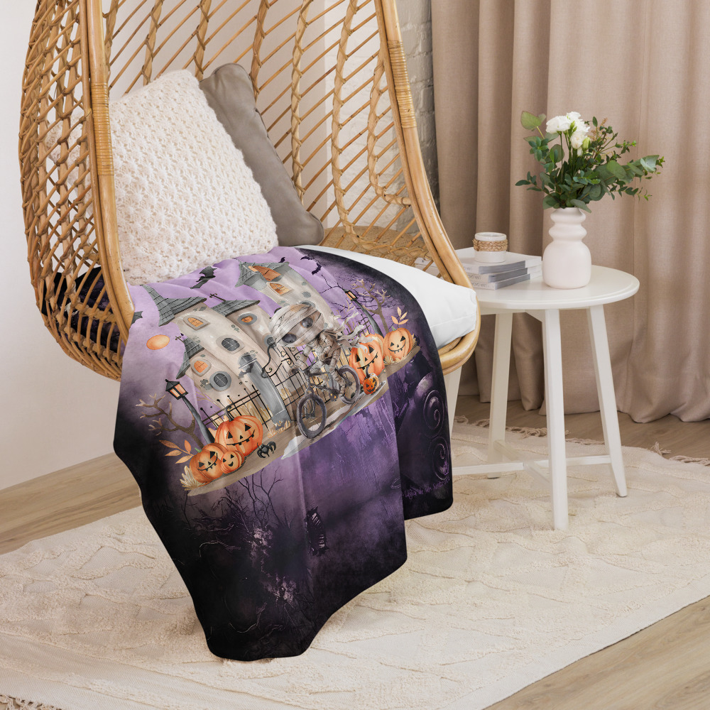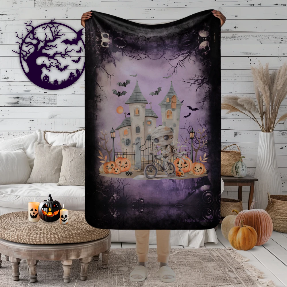 Manta de misterio mullida con bonita momia de cuento en bicicleta con castillo, calabazas y murciélagos