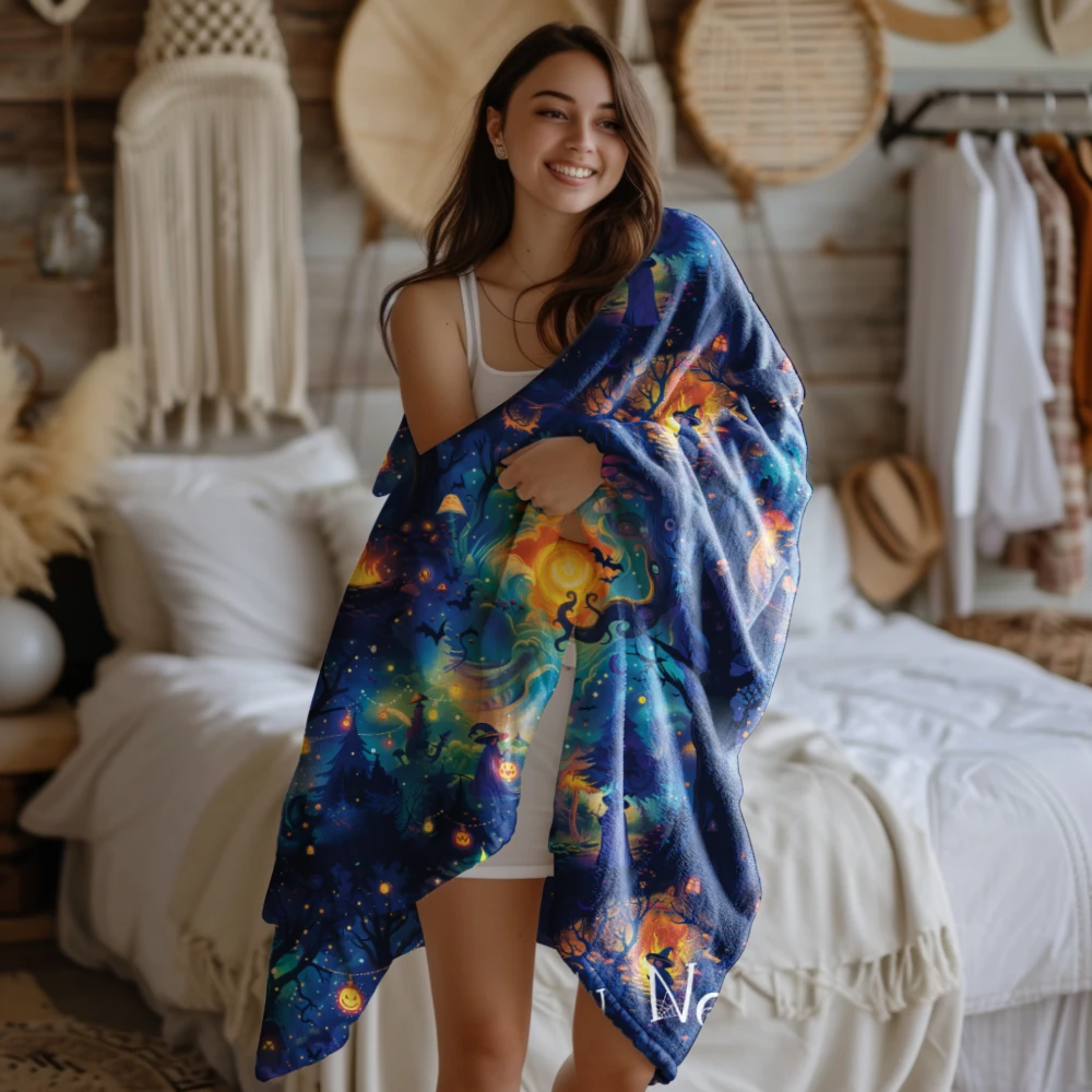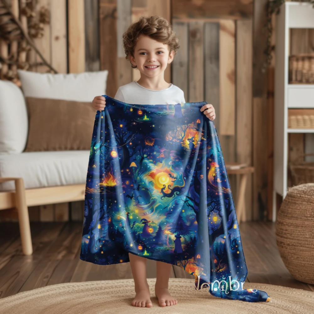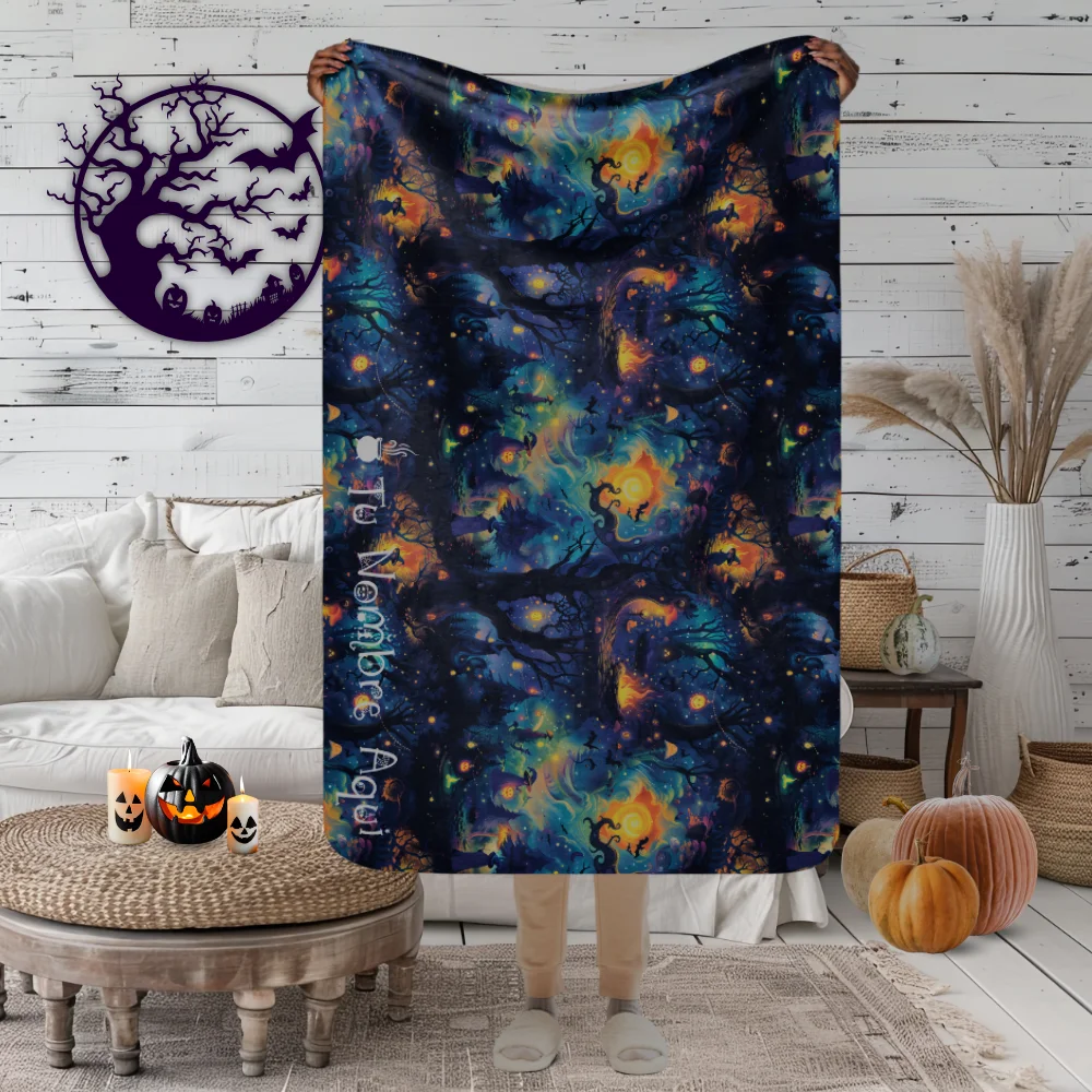 Más allá de su suavidad y calidez, esta manta tiene un diseño que invita a soñar. Las escenas nocturnas, iluminadas por hogueras y calabazas brillantes, evocan paisajes de cuento donde la magia cobra vida. Es una manta que no solo abriga, sino que también inspira y transforma cualquier rincón en un espacio especial.