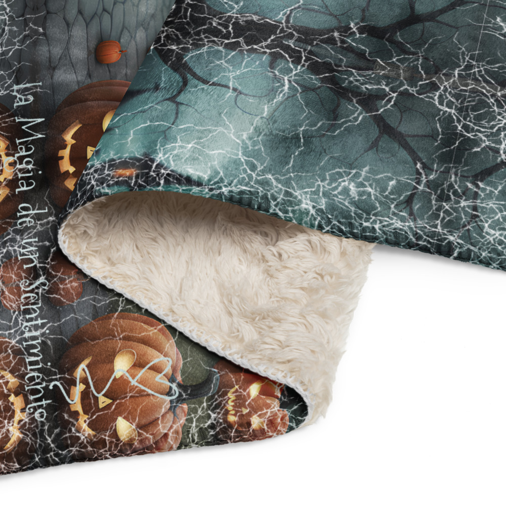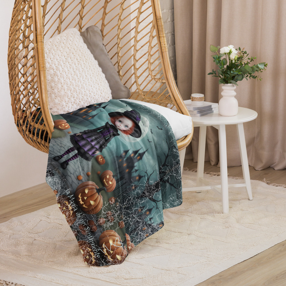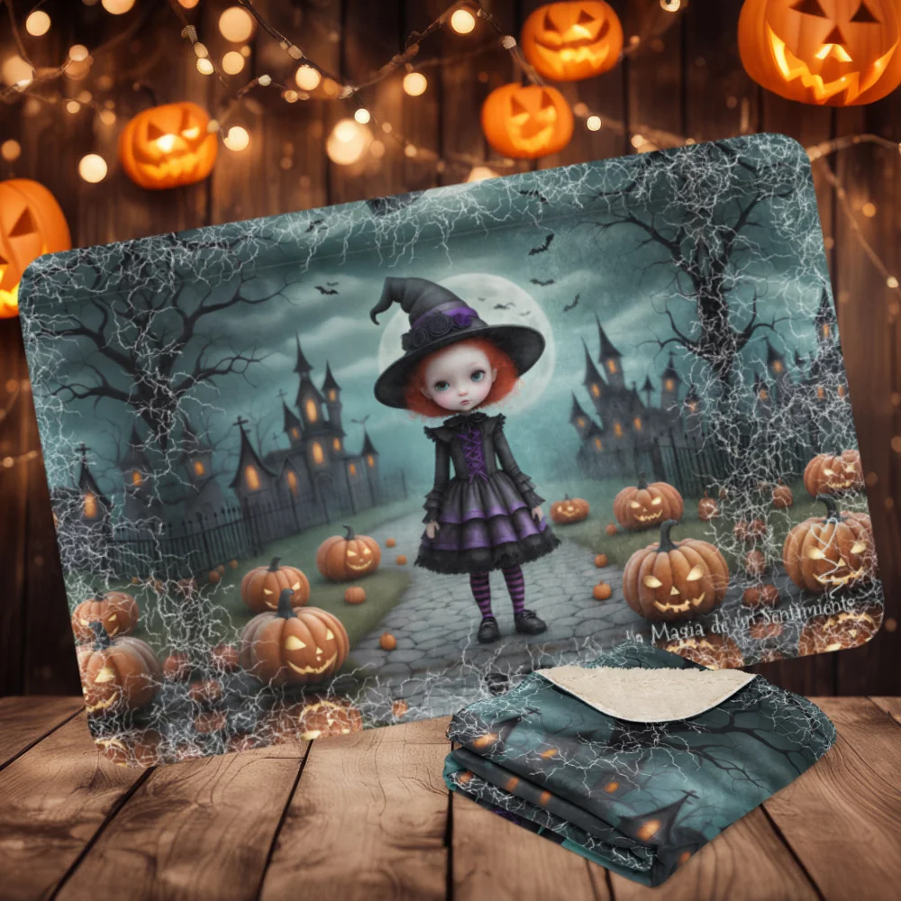 Manta de misterio mullida con niña brujita pelirroja de ojos grandes en fondo con castillo y calabazas
