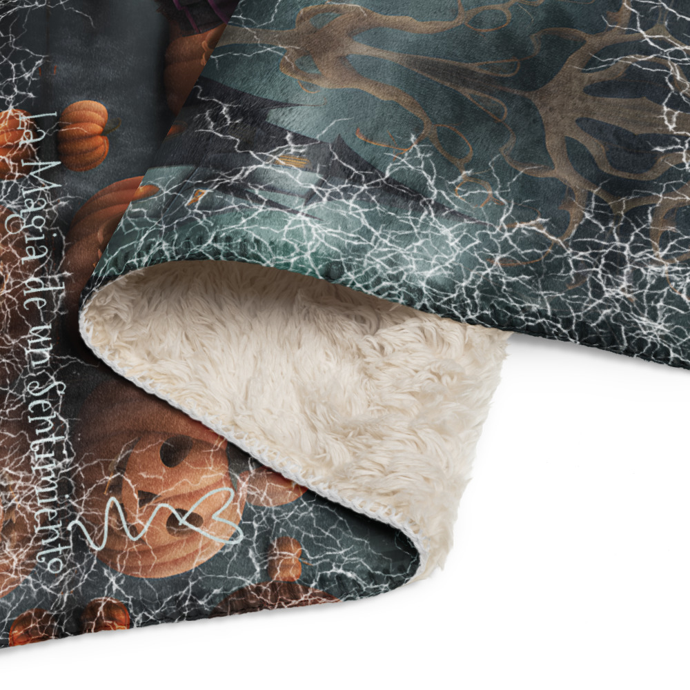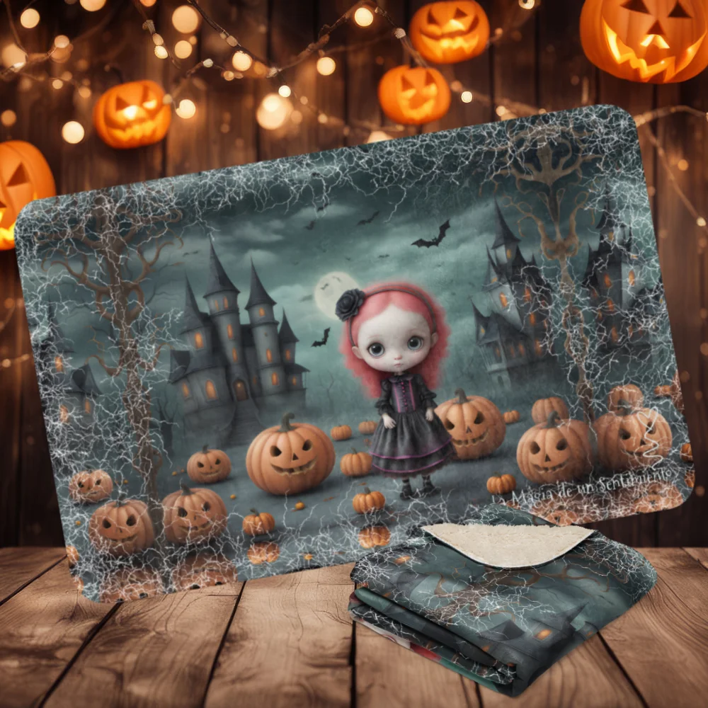 Manta de misterio mullida con niña de ojos grandes con flor negra en fondo tenebroso con castillo y calabazas