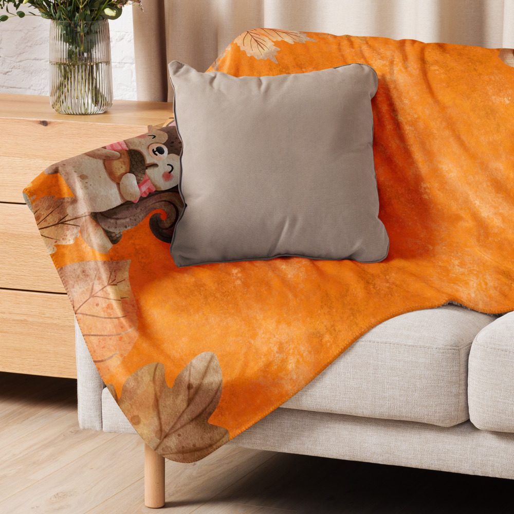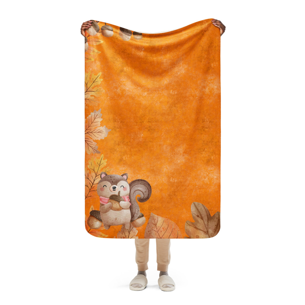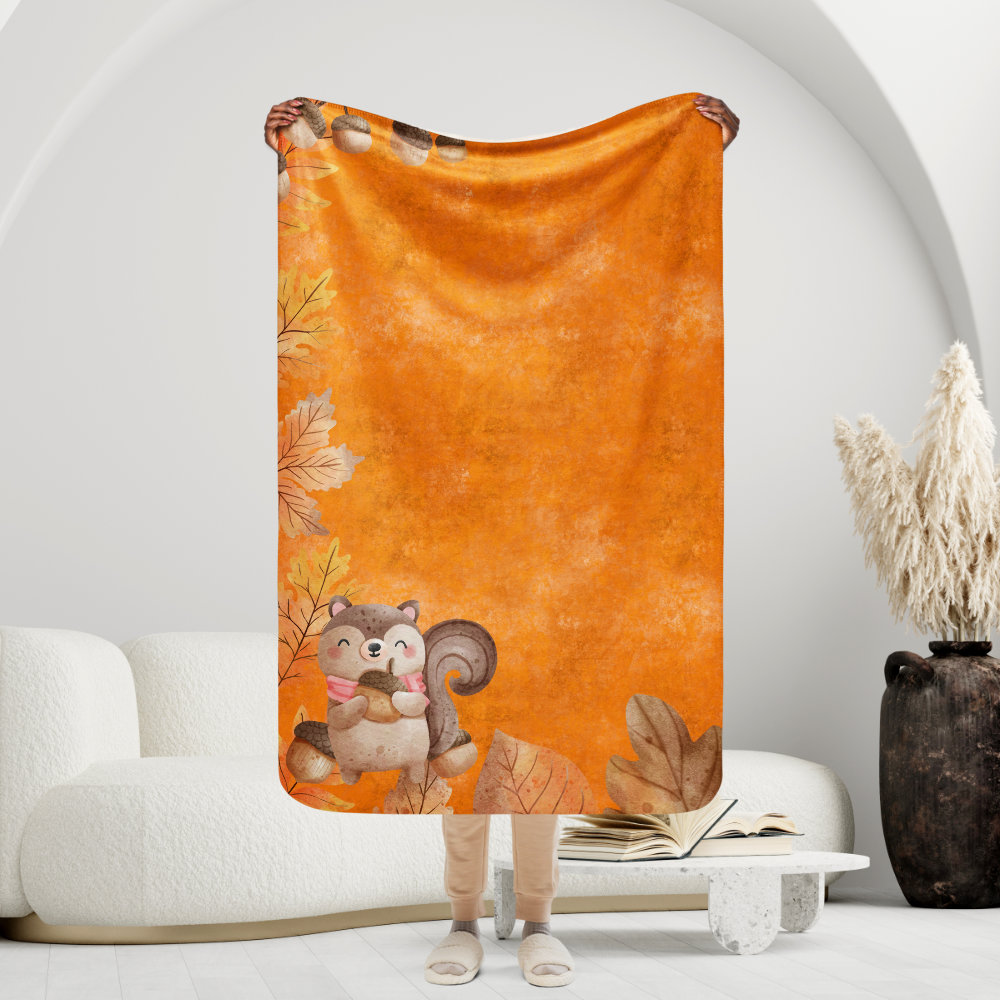Manta mullida con ardilla y bellotas en fondo naranja con hojas de otoño
