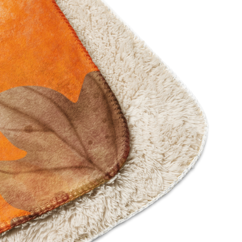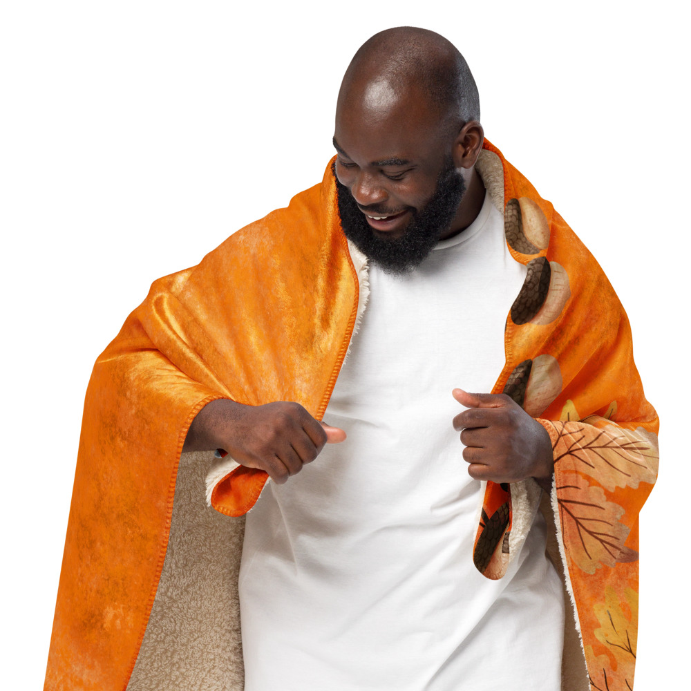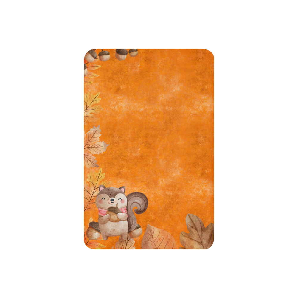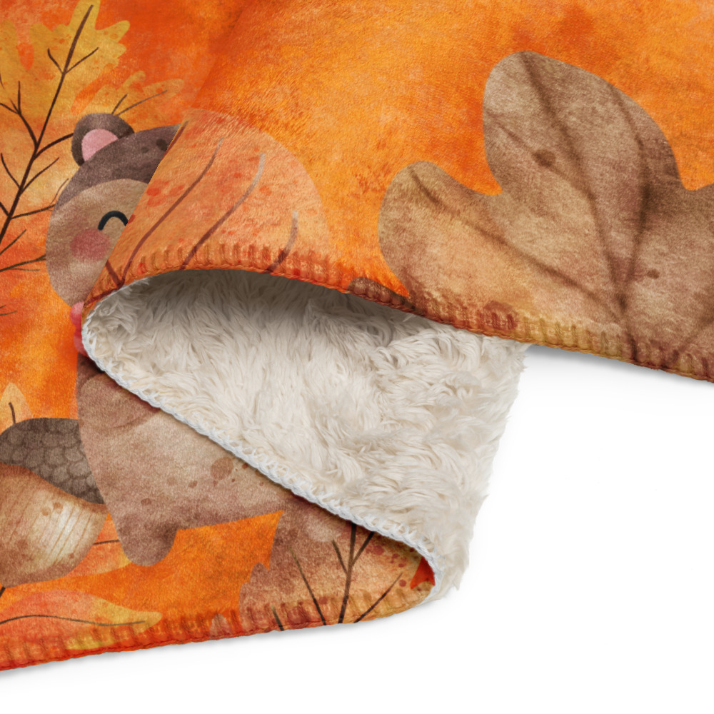 Manta mullida con ardilla y bellotas en fondo naranja con hojas de otoño