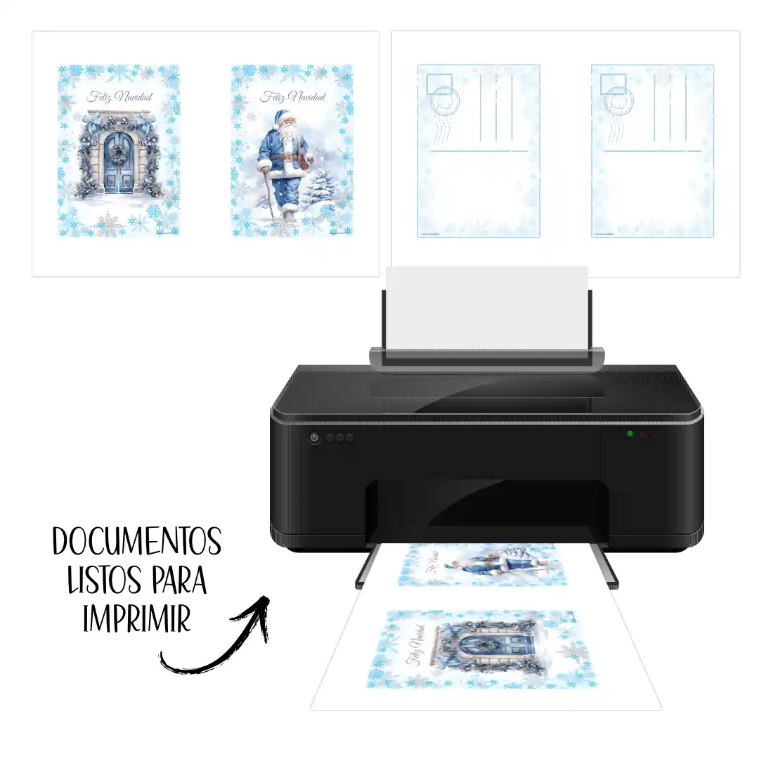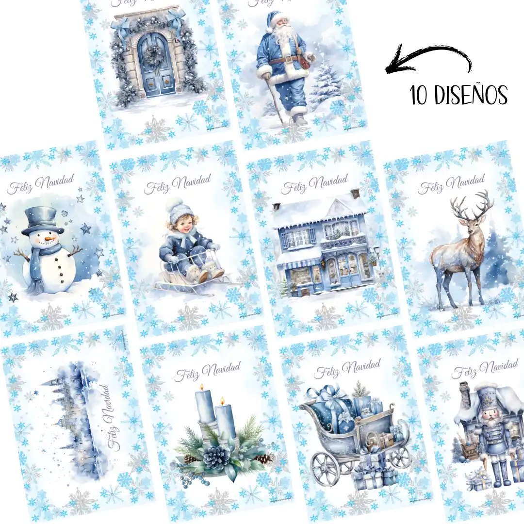🖨️ Detalles del Producto: 📏 10 diseños únicos de postales navideñas en tonos azules y blancos.