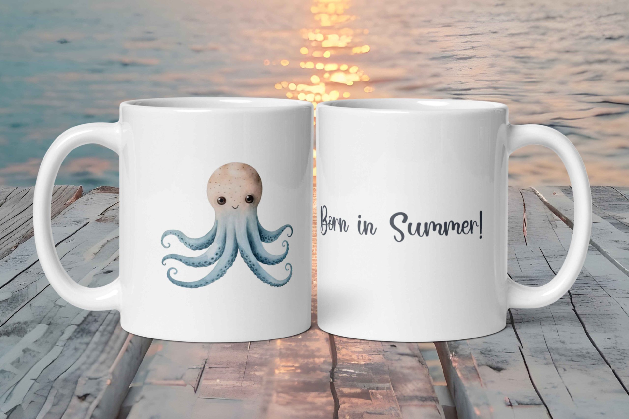 Taza Blanca Brillante con Bonito Pulpo “Born In Summer!”