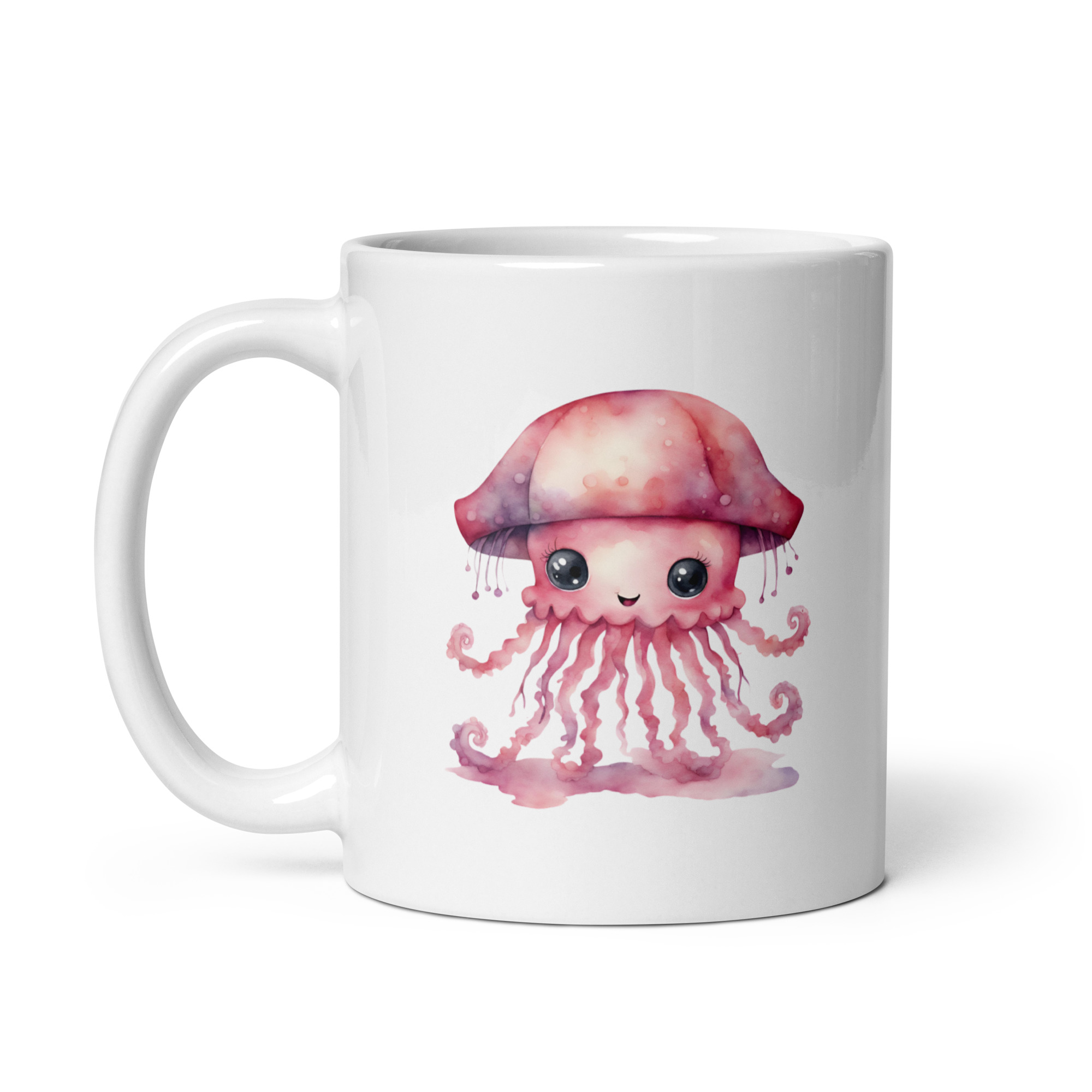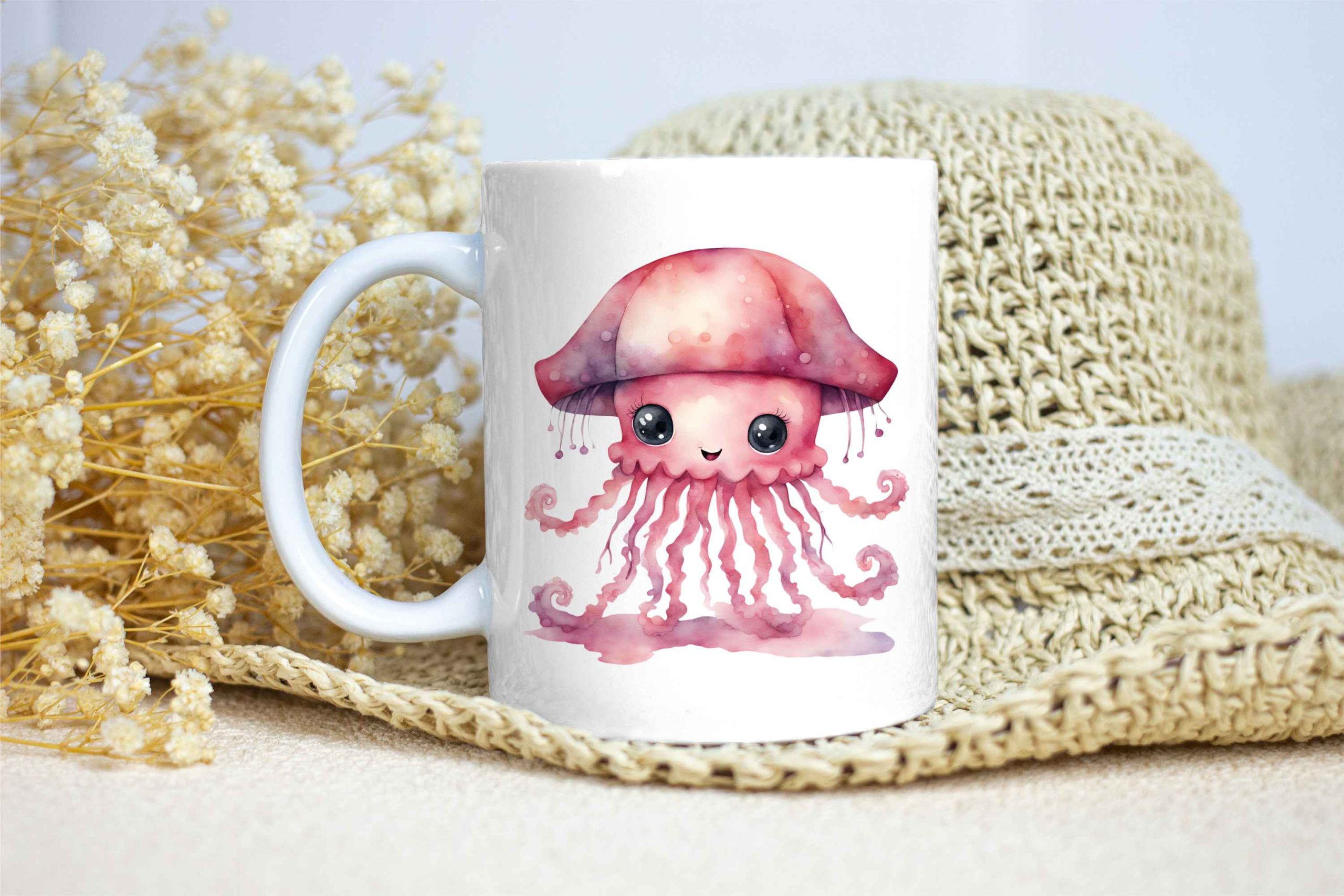 Taza Brillante con Bonita Medusa Rosa con Sombrero de Lluvia