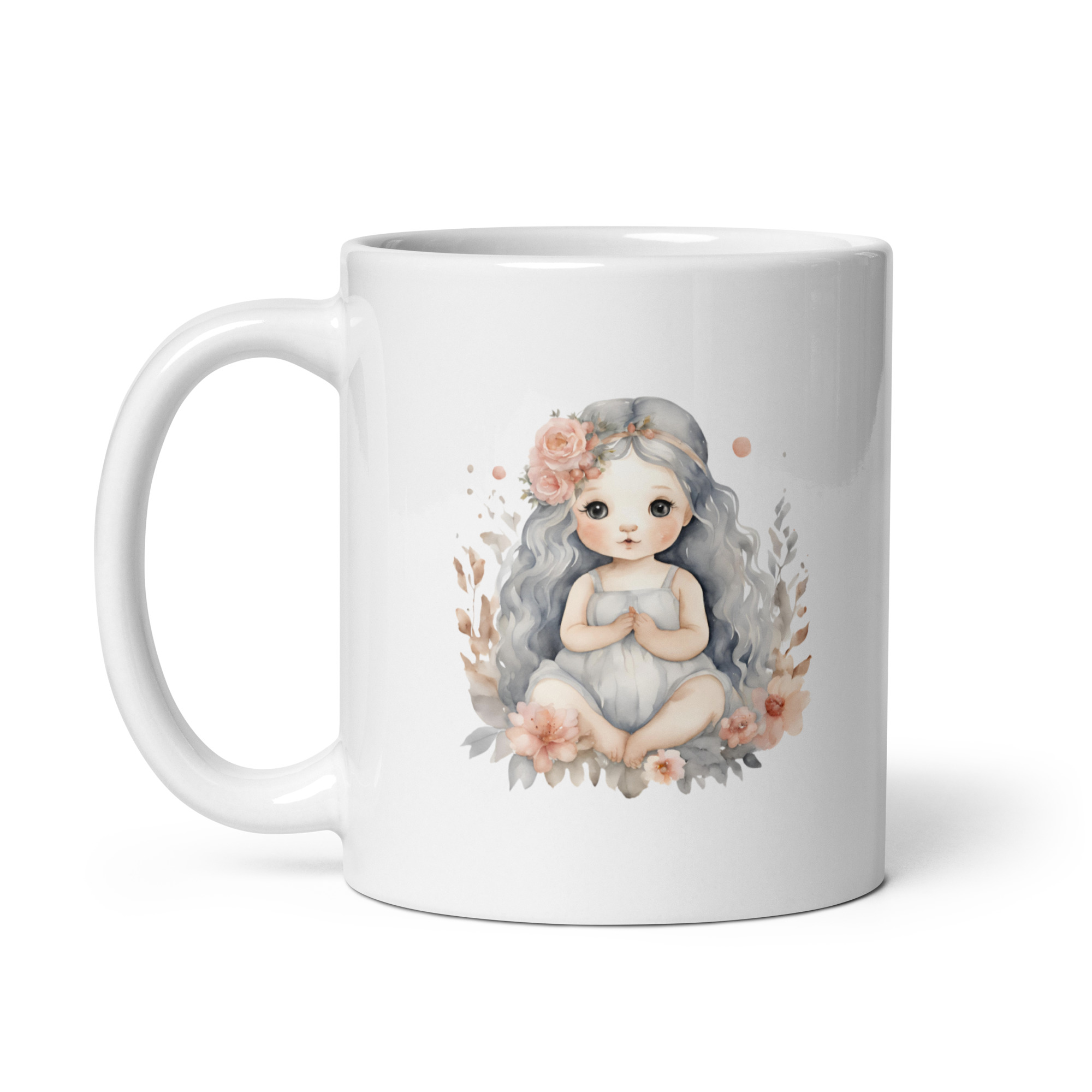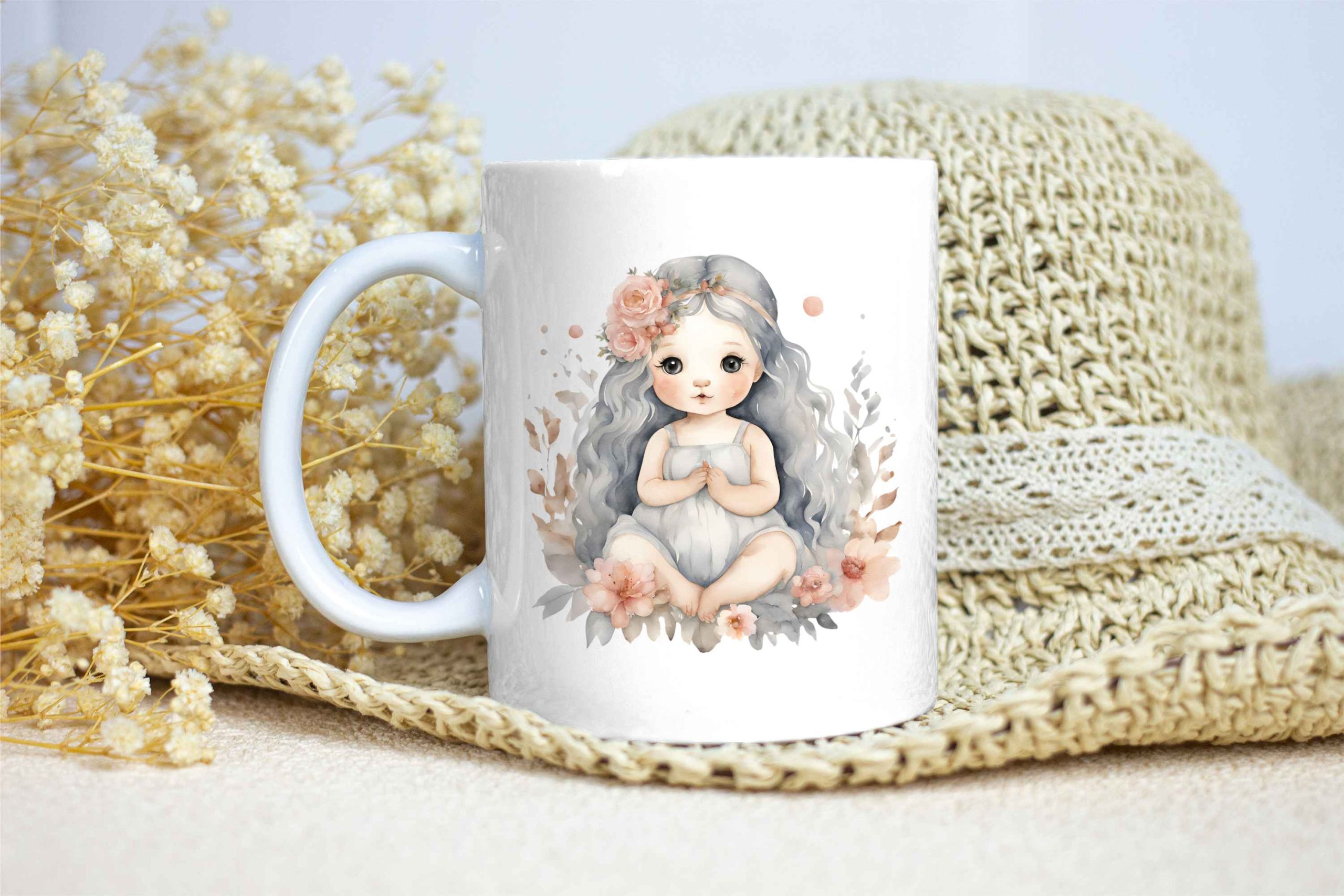 Taza Brillante con Bonito Dibujo de Niña del Océano con Diadema, Flores y Hojas