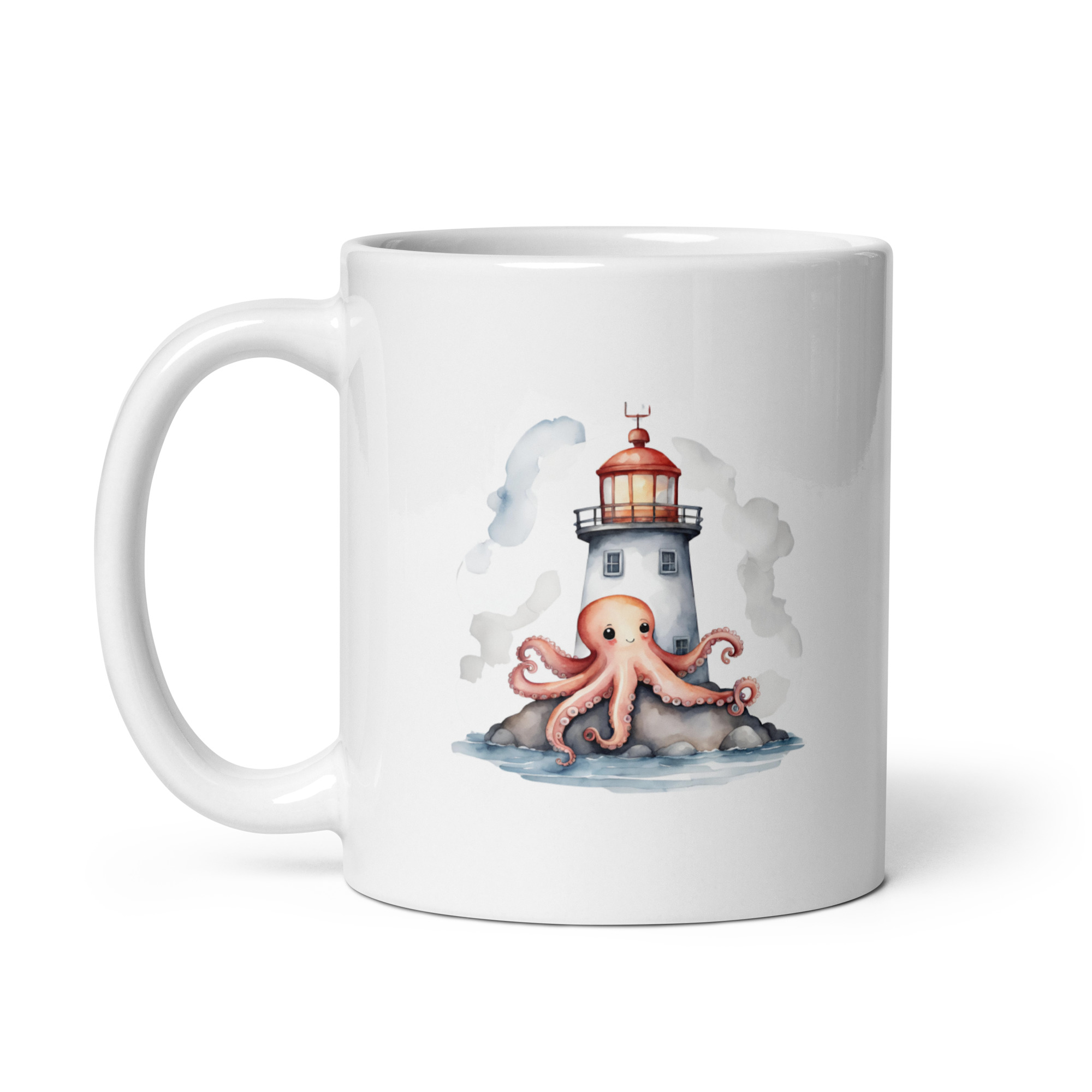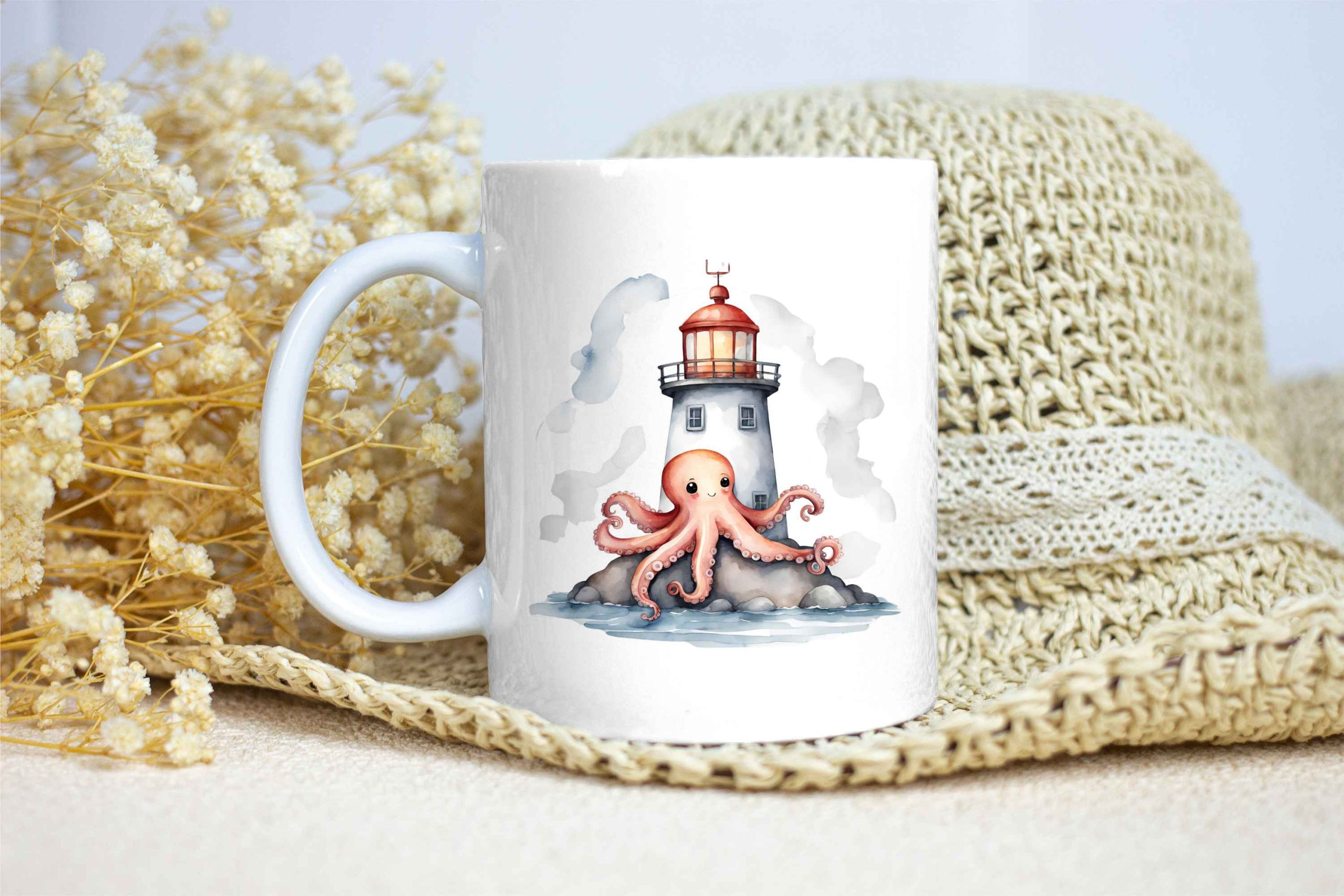 Taza Brillante con Pulpo Feliz en un Bonito Faro