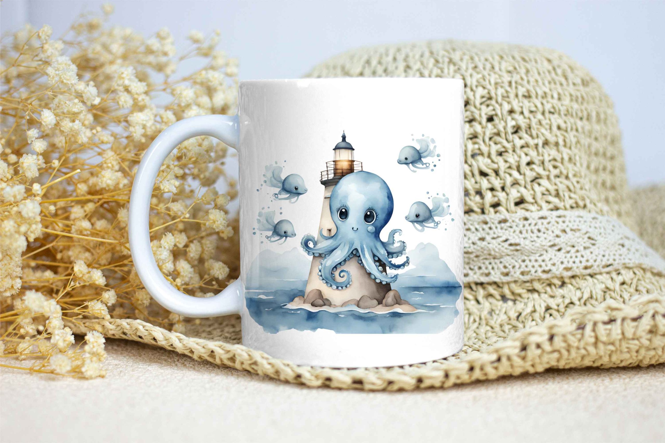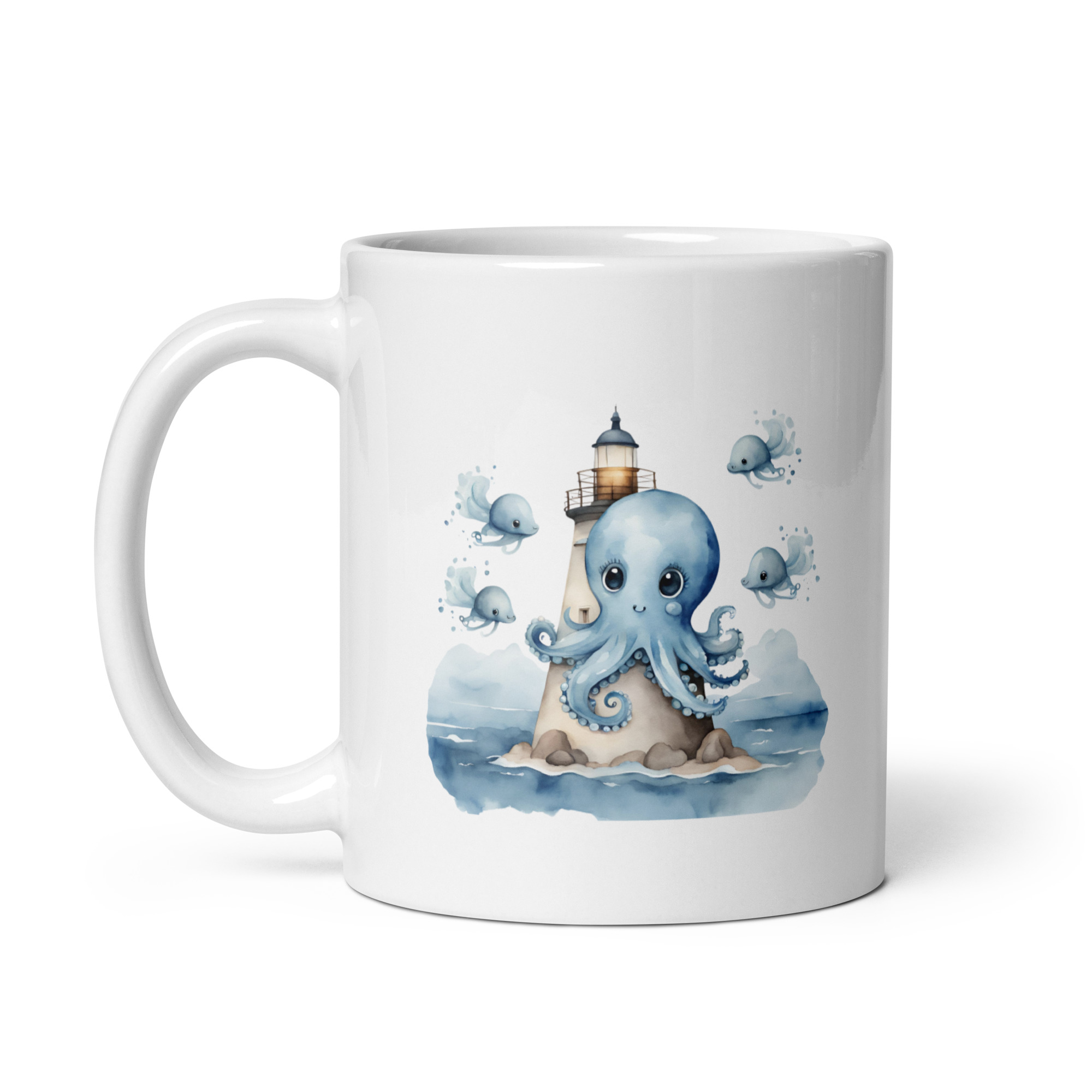 Taza Brillante con Pulpo y Faro con Peces de Fantasía