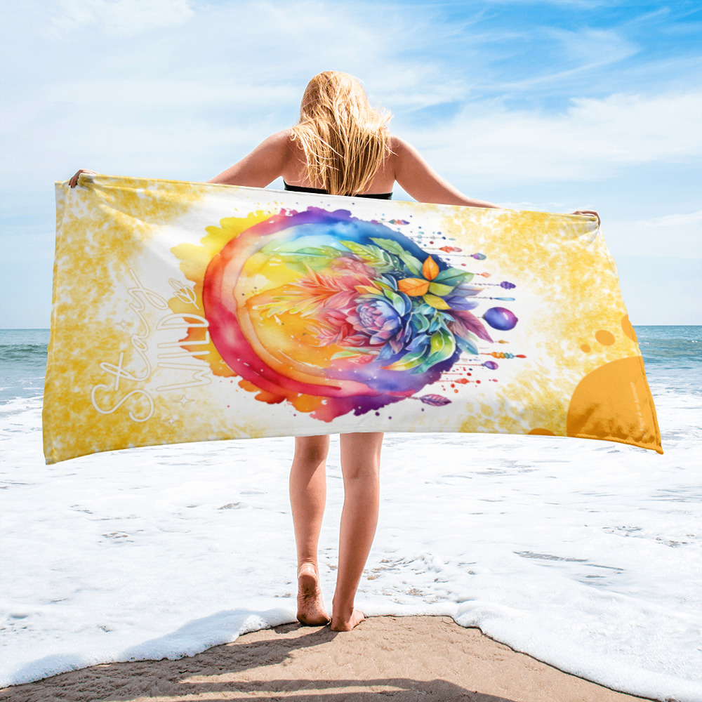 Toalla de playa “Stay Wild” con fondo estilo acuarela arcoíris, boho y actual – Fondo amarillo